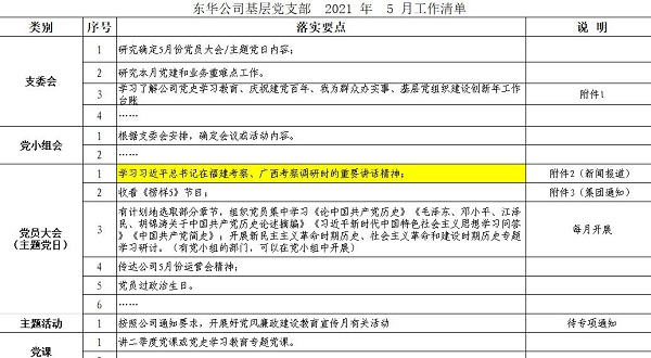 MK(中国)党委积极响应相关工作部署和要求,及时将习近平总书记在广西考察期间重要讲话精神作为党史学习教育的一项重要内容。5月6日,五一假期后上班第一天,公司党委就将《习近平总书记在福建考察、广西考察调研时的重要讲话精神》纳入了《东华公司基层党支部2021年5月份工作清单》并向各基层党组织发起学习研讨任务要求。